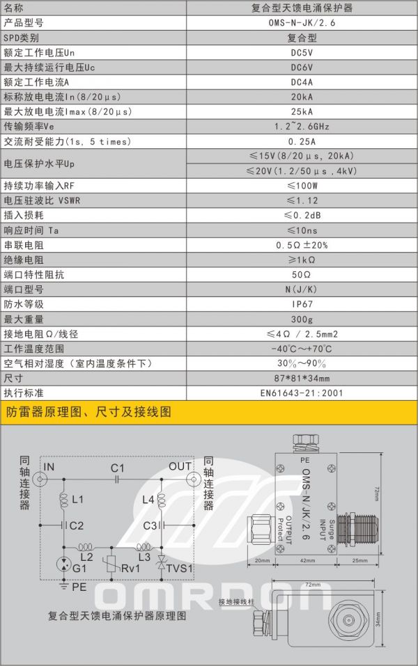歐姆雷盾(OMRDON)1.2-2.6G天饋電涌保護器(SPD、防雷器)是專門為GPS/BD通訊基站通信頻段收發系統設計,使其免遭由天饋線引入的感應雷擊及靜電放電等過電壓損壞。本產品具有防水、防塵功能,可用于室外安裝場所。