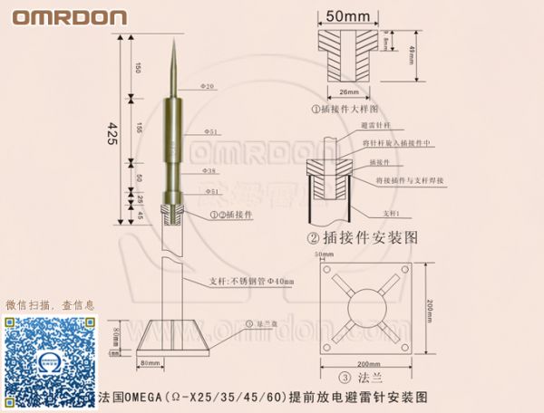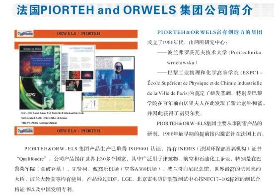 OMEGA:Ω-X提前放電避雷針由法國PIORTEH & WRWELS集團公司研制,公司已取得ISO9001認證,持有INERIS(法國環保直屬機構)證書,公司產品銷住世界30多個國家和地區,廣泛用于建筑物、航空、和石化企業,如:巴黎榮軍院(拿破侖墓)、先賢祠、戴高爾機場、波蘭哥白尼紀念館、世界最高的法國米約大橋、波蘭大教等名建筑中均有使用。產品已通過EDF、LGE、北京雷電防護裝置測試中心的檢測報告和中國發明專利,產品由太平洋保險公司承保。