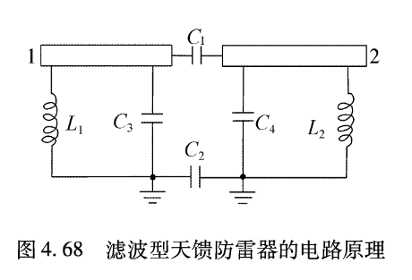③濾波型天饋防雷器:這是利用微波傳輸原理制成的,如圖4.68所示。圖中1~2為微帶或同軸傳輸線,C1和C2為高壓隔直電容,它們將傳輸線分成兩段,只允許射頻信號通過而阻止直流和雷電等值頻率的能量通過。L1和L2為集中或分布參數構成的電感,它們決定了防雷器的工作頻率。C3和C4為傳輸線的分布電容,該保護電路實際上形成-個高通濾波器。