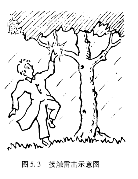 接觸雷擊大多數都是在雷電放電時,人的手或軀干碰到了建筑物避雷裝置的引下線,或與其相連的自來水管、電氣設備的接地線等情況下發生的。圖5.3所示為人在大樹下避雨時,人的手不小心碰到了著雷的大樹樹杈所發生的雷擊情況。當雷電流沿著大樹的樹干入地時,由于樹干有電阻和電感,因而從手與樹權的接觸點到地面的這一段樹干上便存在著一一個電位差,這稱之為“接觸電位差”或“接觸電壓”,它可以表達為: