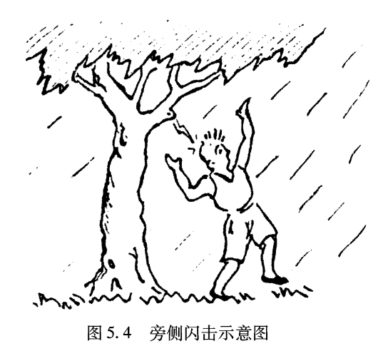 如上所述,當雷電擊到某- - 物體上時,該物體便被充電到幾萬伏,甚至幾十萬伏的高壓上,有時人站在這個被雷擊的物體附近,盡管人體的任何部位,如手和腳等都沒有碰到該物體,但是人體與大地是等電位的,人的頭頂或軀干與等高的被雷擊物體之間形成的高電位差超過了其間空氣的擊穿強度,這時雷電流也會由高電位的被雷擊物體,通過這段空氣間隙向人體放電,于是人體便會遭受到不測的雷電襲擊,如圖5.4所示。這稱之為旁側閃擊或側擊。
