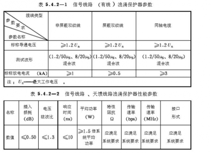 2.電子信息系統(tǒng)信號線路浪涌保擴器的選擇,應根據(jù)線路的工作頻率,傳輸介質(zhì),傳輸速率,傳輸寬帶,工作電壓,接口形式,特性阻抗等參數(shù),選用電壓駐波比和插入損耗小的適配的浪涌保護器.信號線路浪涌保護器參數(shù)應符合表5.4.2-1,5.4.2-2的規(guī)定