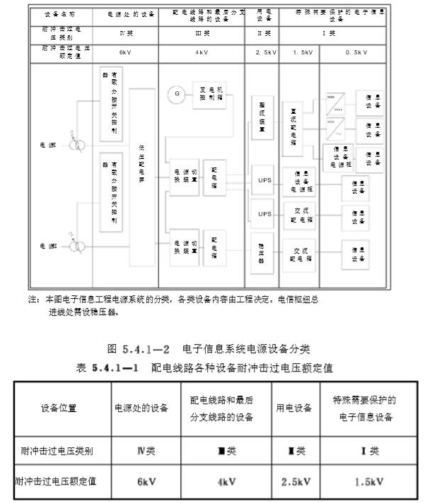 3.配電線路設備的耐沖擊過電壓額定值應符合表 5.4.1-1規定. 電子信息系統設備配電線路浪涌保護器安裝位置及電子信息系統電源設備分類示意如圖5.4.1-1和圖5.4.1-2所示。