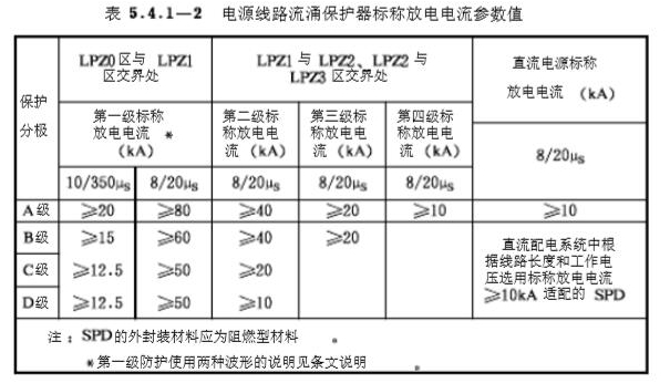 7.用于電源線路的浪涌保護器標稱放電電流參數值宜符合表5.4.1-2規定。