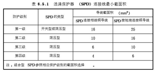 3.浪涌保護器(SPD)的連接導線最小截面積宜符合表6.5.1的規定