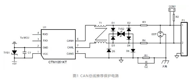 許多應用要求滿足IEC61000-4-2靜電放電4級,IEC61000-4-5浪涌抗擾4級要求。一般的收發器ESD、浪涌的防護等級均比較低,如CTM1051M隔離CAN收么器的隔離耐壓為2500VDC,裸機情況下,ESD、浪涌等級均較低,所以有必要增加外圍電路。