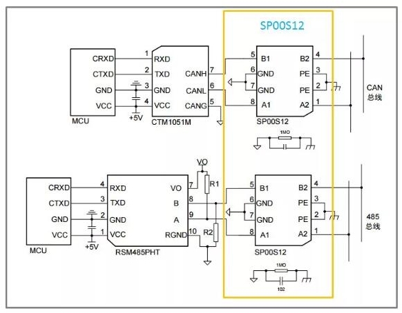 分立元器件方案雖然能夠提供有效的防護,但是需要引入較多的電子器件,這也就意味著接口電路將占用更多的PCB空間,若器件參數選擇不合適易造成EMC問題。有沒有更簡潔的防護設計呢?答案是肯定的。可選擇引入專業的信號浪涌抑制器SP00S12,可用于各種信號傳輸系統,抑制雷擊、浪涌、過壓等有害信號,對設備信號端口進行保護。搭配ZLG的全隔離CTM或SC系列的隔離CAN收發器,如下圖。可極大程度的提升產品的集成度,于此同時極大程度的縮小開發周期。