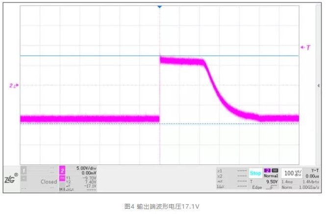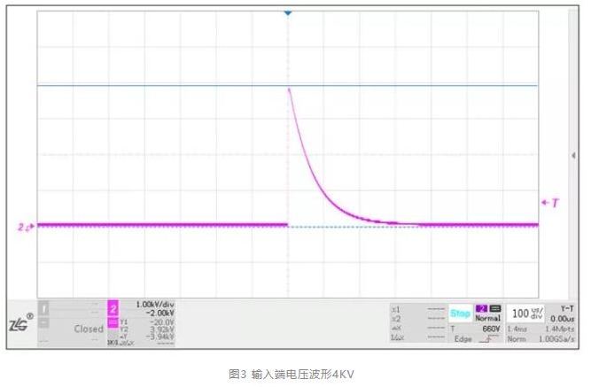 接下來做一下浪涌抗擾度測試,檢驗一下浪涌抑制器是否滿足IEC61000-4-5±4KV防護要求,以共模浪涌測試為例,在SP00S12輸入端加載4KV、1.2/50μs浪涌電壓,在輸出端測試壓降已被降低至17.1V,波形圖如下。